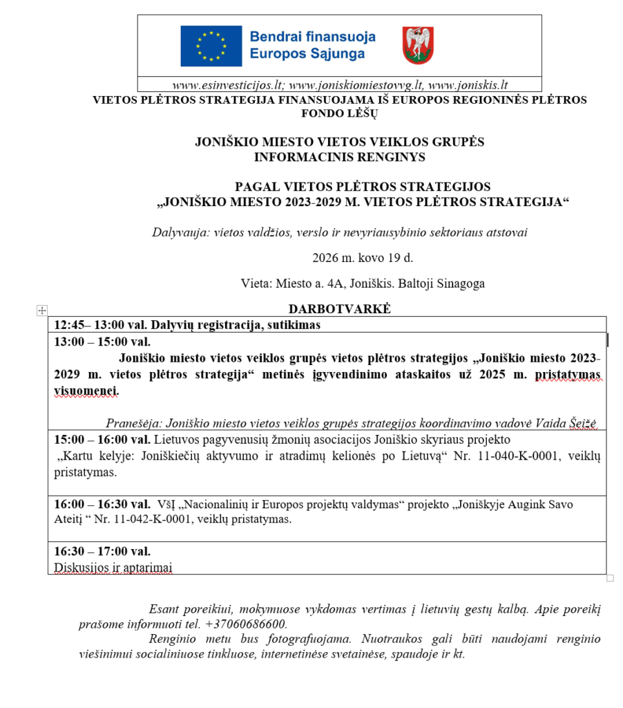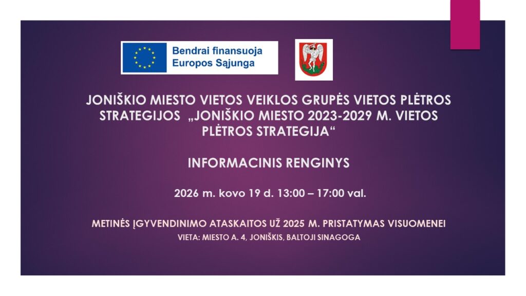 2026-03-19 įvyko Joniškio miesto vietos veiklos grupės informacinis renginys pagal įgyvendinamą vietos plėtros strategiją „Joniškio miesto 2023-2029 m. vietos plėtros strategija”.